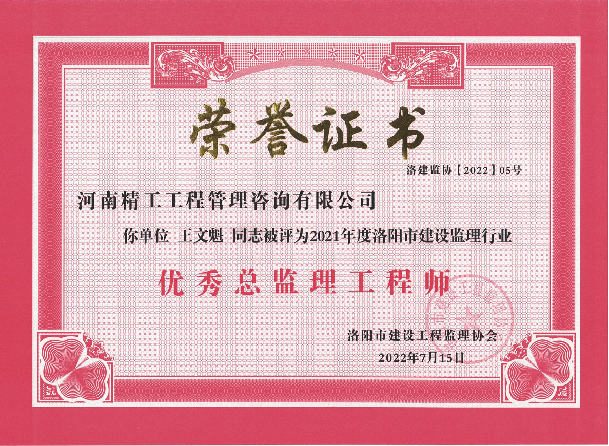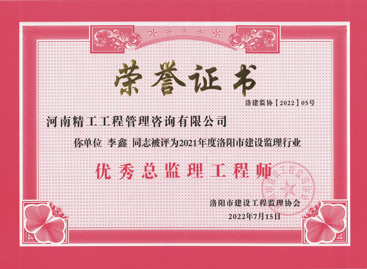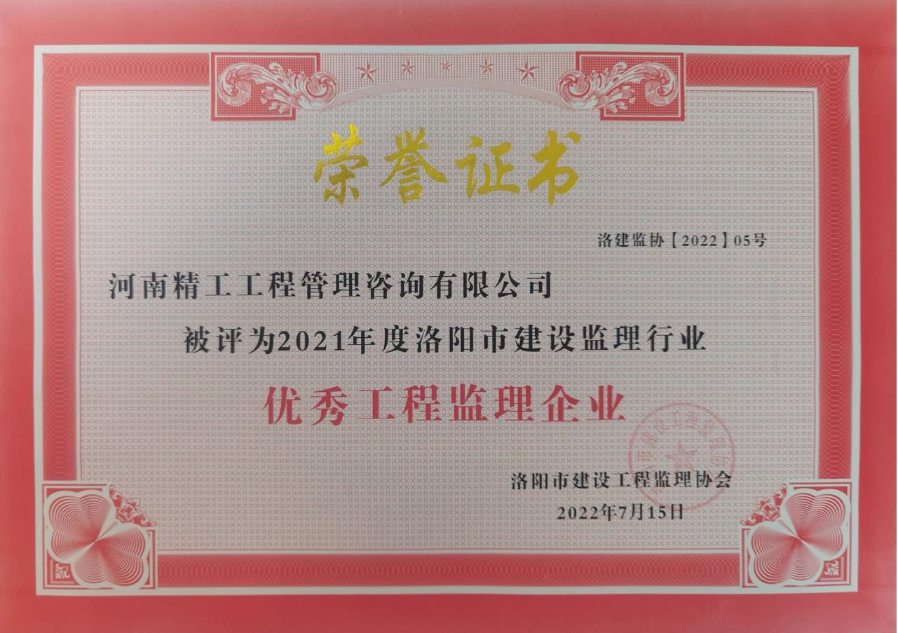 2022年7月18日,洛陽市建設工程監理協會關于表彰2021年度洛陽市誠信建設先進工程監理企業、優秀總監理工程師、優秀監理工程師、優秀監理員的決定,河南精工工程管理咨詢有限公司榮獲“2021年度優秀工程監理企業”,公司2名員工榮獲“2021年度優秀總監理工程師”,2名員工榮獲“2021年度優秀監理工程師”,2名員工榮獲“2021年度優秀監理員”榮譽稱號。